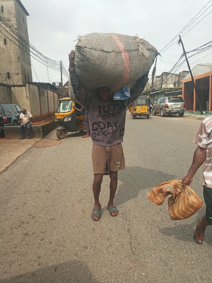 The image displays an urban street scene in Onitsha, Nigeria, under an overcast sky. A dark-skinned male, positioned centrally, is carrying a large, bulky, grayish-brown woven sack with a single vertical red stripe on his head, supported by his raised arms. He wears a gray long-sleeved sweater with "TO DAY YESTERDAY TODAY" text, brown shorts, and gray slide sandals. To his immediate right, partially visible, is the lower body of another dark-skinned male walking, holding a light brown, crumpled sack in his left hand; he wears dark shorts and flip-flops. In the left background, a dark-skinned male is seated on a concrete ledge, wearing a light-colored polo shirt and dark trousers, next to a parked dark SUV. A yellow-orange motorized rickshaw is visible behind the central figure, followed by a silver SUV parked further down the street, and another yellow-orange rickshaw in the distance. The paved asphalt road is visible in the foreground. On the left, a tall, weathered multi-story concrete building with exposed electrical wiring stands behind a concrete wall. On the right, utility poles with numerous overhead wires rise against the pale sky, and various urban buildings, including one with an orange-red facade, line the street. The scene depicts active manual labor and vehicular presence on a city street.