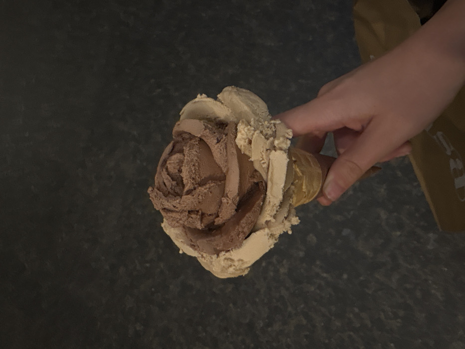 A light-skinned hand holds an ice cream cone in the city of Puebla, Mexico. The ice cream is artfully sculpted into the form of a blooming rose, featuring two distinct flavors: a darker brown comprising the inner petals and a lighter beige forming the outer petals. The ice cream is contained within a standard light brown waffle cone, gripped by the thumb and forefinger. A section of a light brown paper bag with a partially visible dark logo is present in the lower right quadrant. The background consists of a dark, textured surface, appearing to be pavement.