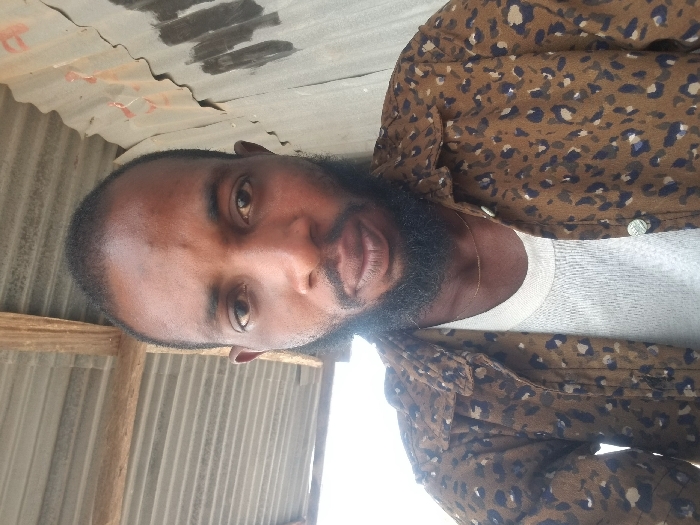 A male individual is depicted in a head-and-shoulders portrait, positioned against a backdrop of corrugated metal sheeting and wooden structural beams