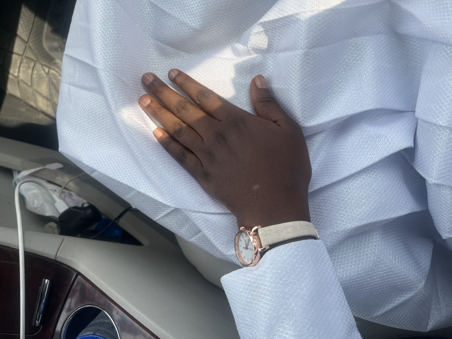 The scene depicts the interior of a vehicle in the city of Iranla, Nigeria, observed from a high-angle perspective. A person's dark-skinned left hand, wearing a rose gold-colored watch with a light-colored strap, rests palm-down on a white, textured fabric garment or cover. The fabric exhibits a fine, repeating geometric pattern. To the left, a segment of the vehicle's interior is visible, featuring a light-colored plastic panel with a dark wood-grain trim insert. A cup holder contains a clear plastic water bottle with a blue cap. White cables are visible in the background, along with a crumpled white plastic bag and other indeterminate objects. Strong natural sunlight illuminates the hand and fabric, casting distinct shadows within the vehicle's cabin.