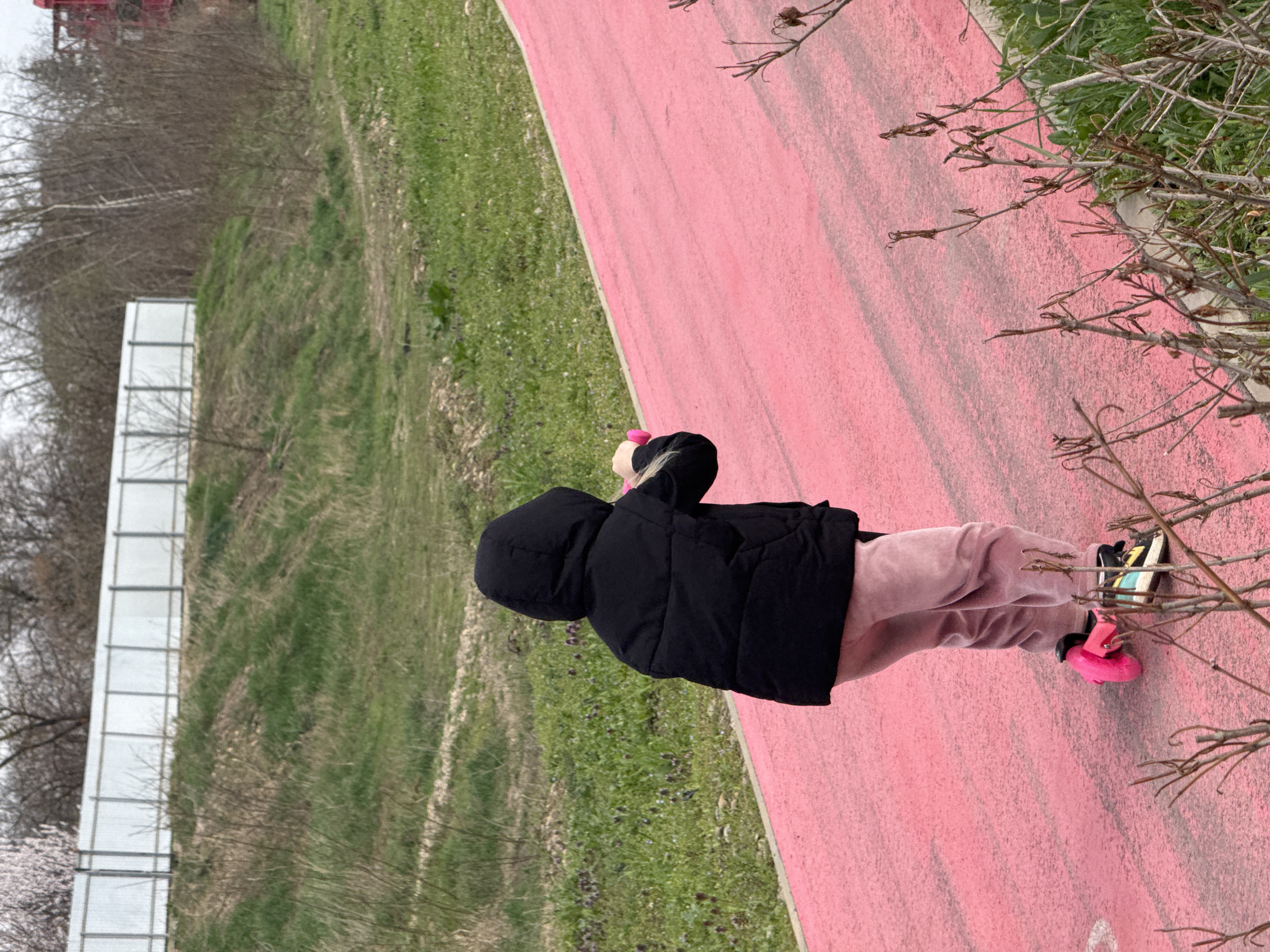 A young child in a black hooded puffer jacket and pink pants stands on a pink pathway adjacent to a grassy area in Kurganinsk, Russia