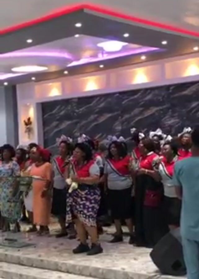 A large group of women in a choir setting stand on a stage covered in marble tiles, singing together. They are dressed in casual clothing, with many wearing red or gray shirts and distinct headpieces resembling white crowns with ribbons. A woman in the center holds a microphone and appears to be leading the singing. The environment suggests an indoor event space, possibly a church or auditorium, featuring modern lighting with colored accents on the ceiling. A man standing off to the side with a light blue outfit seems to be involved in managing the event or listening to the performance. A clear podium stands at the front.