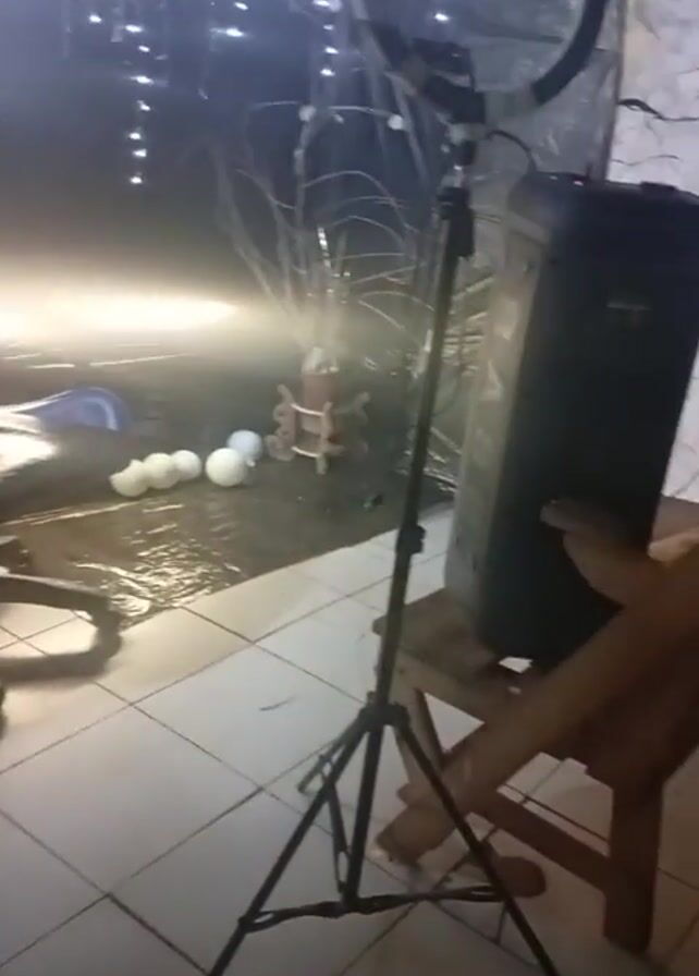 dimly lit indoor space, possibly a room. A ring light on a tripod stands in the foreground, positioned beside a black speaker placed on a wooden chair. In the background, decorative string lights hang above what appears to be a dark, reflective surface, possibly water or a sheet of reflective material. There are also decorative objects, including white spheres and a small cart, scattered around the surface. The floor is tiled. The lighting is uneven, contributing to the low-visibility conditions. The camera slightly pans to the right to offer a broader view of the scene.