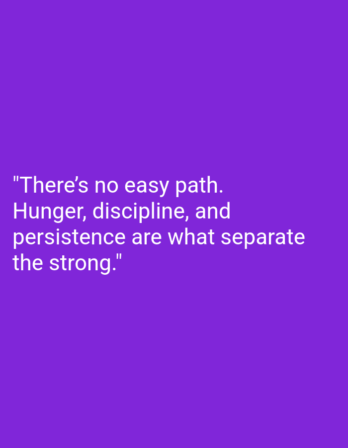 The image displays a digital graphic with a solid, uniform purple background. White sans-serif text is centered in the lower-left quadrant of the frame, presenting the quote: "There's no easy path. Hunger, discipline, and persistence are what separate the strong." No people, subjects, objects (other than the text), actions, or interactions are depicted. The environment is abstract, consisting solely of the colored background. The image content provides no visual information to determine a specific geographical location, including the city of Targovishte, Bulgaria.