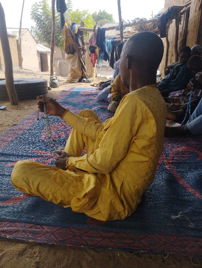 This image depicts an outdoor gathering in Pantame, Nigeria. The primary subject is an adult male, seen from the back-right side, seated cross-legged on a blue, red, and black patterned woven mat. He wears a long-sleeved, loose-fitting yellow garment and holds a strand of white prayer beads in his right hand. To his right and slightly behind him, several other males are also seated on the same mat, one of whom holds blue prayer beads. The ground immediately surrounding the mat is sandy dirt. In the mid-ground, a dark tire leans against an unseen object, and a grey, kettle-shaped metal object rests on the ground. Further back, clothes are hung to dry on a rudimentary wooden structure supported by poles. Behind these structures, light brown, presumably mud-brick, residential buildings are visible under a clear, bright sky.