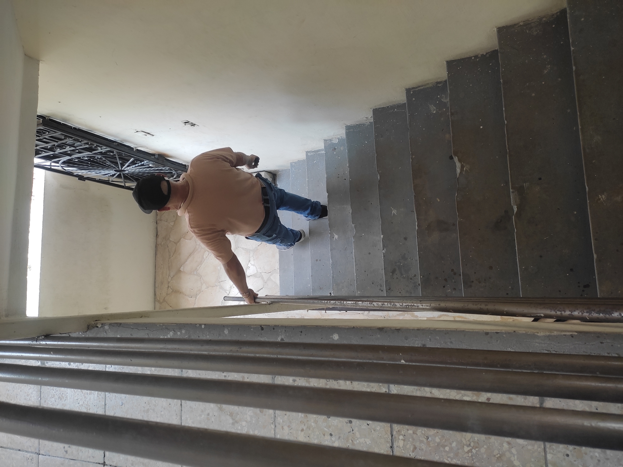 A high-angle shot captures a man descending a staircase in a building, possibly an apartment complex. The man, wearing a tan long-sleeved shirt, blue jeans, a black baseball cap, and dark shoes, holds onto the metal railing for support. The staircase consists of gray concrete steps. The walls are painted in an off-white color, showing signs of wear and tear. Part of a black decorative iron gate can be seen on the landing above. The location is likely Guayaquil, Ecuador, based on the architectural style and materials. The staircase appears to be in a residential building.