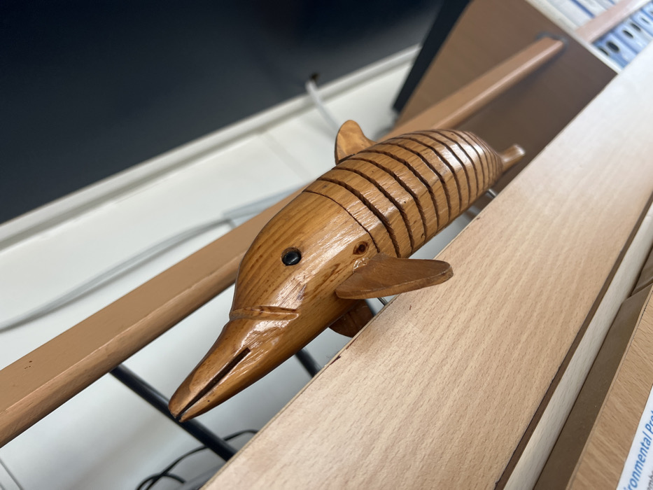 A wooden figurine resembling a marlin or swordfish, light brown with a polished finish, rests on a light-colored wooden shelf. The figurine features an elongated snout, small black bead eyes, and carved pectoral and dorsal fins. Its body is segmented by horizontal grooves, suggesting flexibility or an articulated design. The figurine is oriented diagonally, with its head pointing upwards and to the left. Below it, a label partially visible on another shelf reads "Environmental Prot". The background consists of additional wooden shelving units, some with darker brown accents, and a dark, indistinct area possibly indicating a space behind the shelves, with a white, vertical element suggesting a wall or partition. Visible elements include what appears to be a black cable and a glimpse of what could be file binders on a lower shelf, suggesting an office or library environment. There are no identifiable visual cues within the image to confirm the specific location as Bangor, United Kingdom.