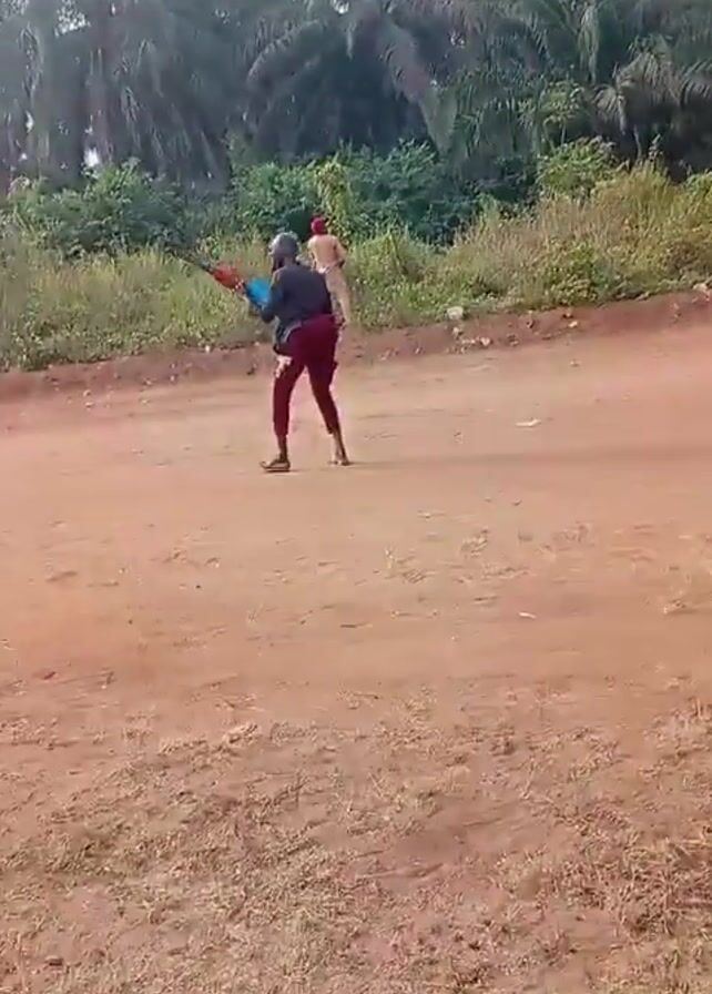 person standing in a dirt road holding what appears to be a toy rifle and waving their arms, with another person standing further away in the background