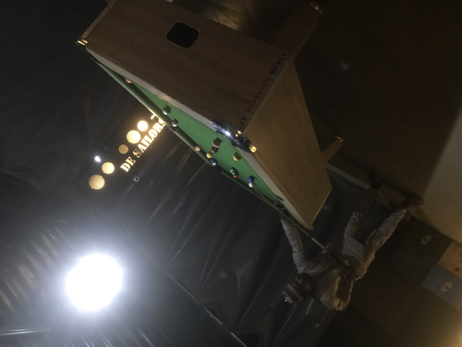 The image, rotated counter-clockwise, depicts an indoor scene at "De Sailors" bar and lounge in Jos, Nigeria. A light-colored wooden pool table with a green felt surface dominates the central and right portions of the frame, laden with multiple colored billiard balls. Partial text "...X SUPERIOR QUALI..." is visible on the table's side. A lone individual, dressed in light-colored long-sleeved attire and a striped head covering, stands on the left, holding a pool cue in a playing posture. Above the pool table, a dark sign displays illuminated golden text reading "DE SAILORS," accompanied by four circular golden lights. A singular, intensely bright overhead light source is visible in the upper left, causing a significant lens flare. The ceiling above is dark, potentially covered with draped material, while the floor below is also dark. In the far left background, stacked crates or boxes are faintly discernible.