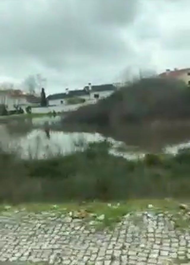 view from a moving vehicle looking at a landscape with a body of water and some houses. The houses are in the background, mostly white with red-tiled roofs. In the middle ground, there's a water area that reflects the sky. The water is surrounded by vegetation, including bushes and trees. In the foreground, there's a stone-paved area, seemingly a street or walkway, with some grass and litter near the edge. A bus stop sign is briefly visible. The sky is overcast and the weather appears gloomy.