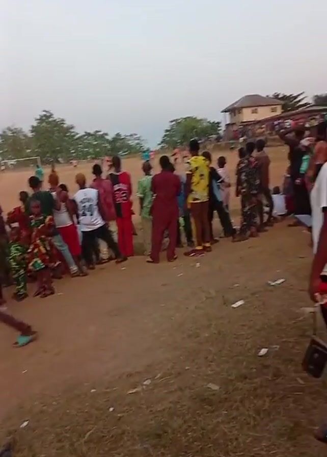 crowd of people standing near a soccer field. The people are diverse in age, gender, and clothing. The environment seems to be a field with sparse grass and dirt, with a building visible in the background. It appears there might be a soccer game going on in the background, though that is unclear. The crowd is generally stationary, with a few people moving around. There is trash scattered on the ground. The overall lighting suggests it may be late afternoon or early evening.