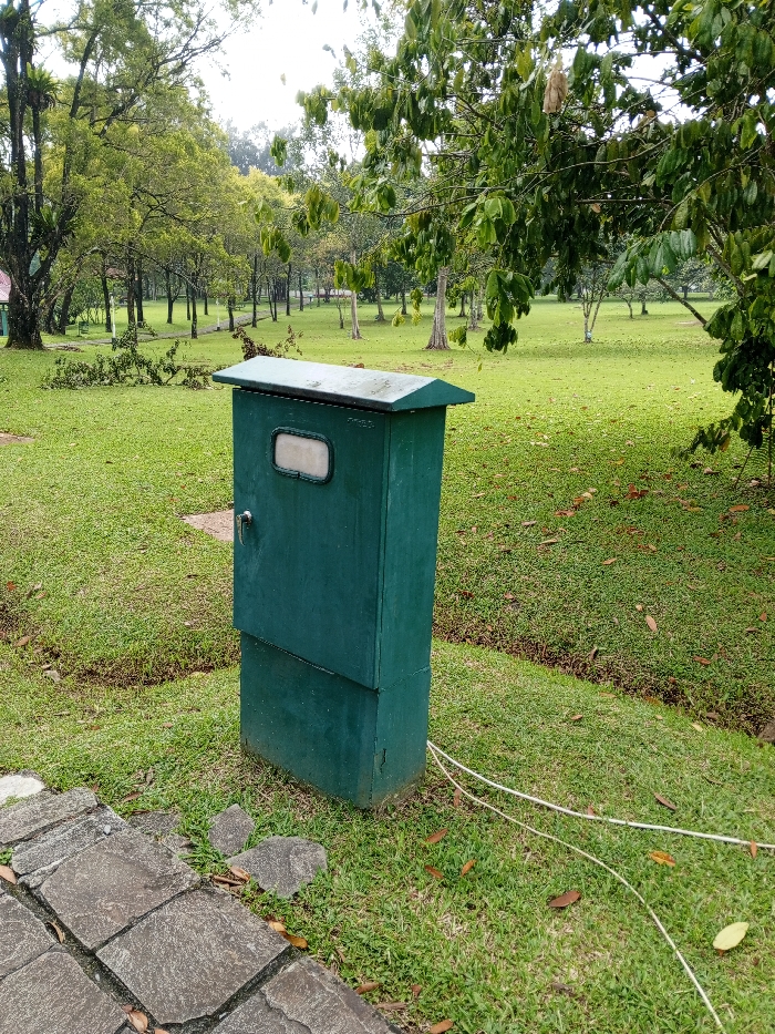 A green utility box sits on a grassy lawn in a park. It has a small window and a handle. White cables extend from the base of the box, across the grass. The park has numerous trees and a path of stone slabs. The scene is overcast with a muted color palette.