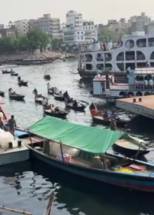 The video presents a bustling river scene, possibly in Bangladesh, with numerous small, wooden boats navigating the water. The boats are carrying people, and some appear to be rowed by a single individual. A larger, multi-level ferry boat is docked nearby, suggesting a transit point. Buildings, most of them painted white, can be seen in the background, indicating an urban setting. The overall atmosphere is one of active river transportation.
