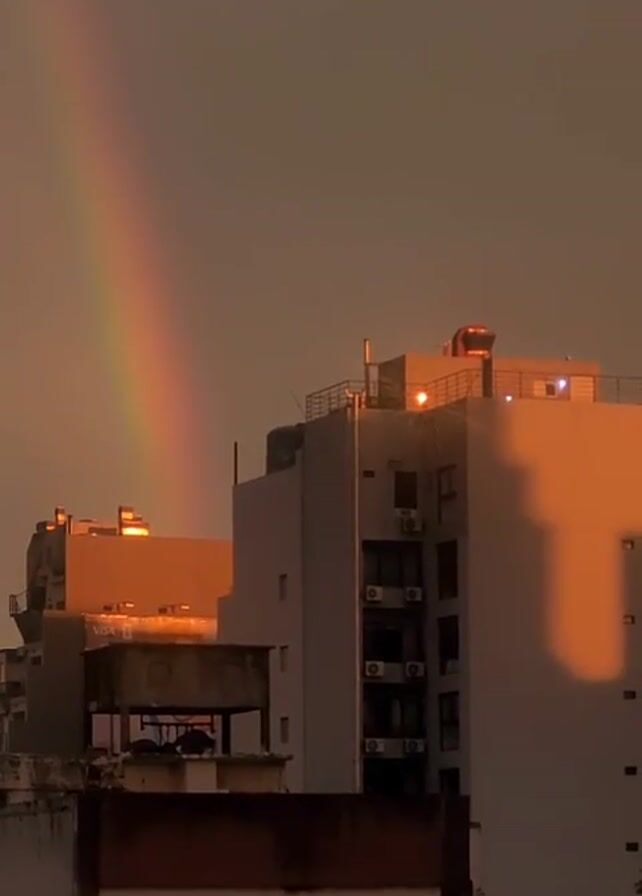 A video shows a rainbow ending behind the tops of buildings in what appears to be a city, during the sunset hours