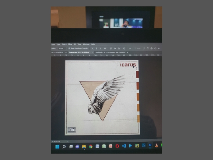 This image captures an indoor scene within the Daxing District, China, focused on a laptop screen displaying graphic design software. The laptop is open, revealing the interface of what appears to be Adobe Photoshop, with menus ("Layer," "Type," "Select," "Filter," "3D," "View," "Window," "Help") and a ruler visible along the top and left edges of the application window. The active tab reads "Icarus.psd @ 25% (RGB/8)," indicating an open project file. The central element on the laptop screen is a square-format graphic design. This design features an off-white or light beige background with subtle texture. A prominent, detailed, grayscale depiction of a feathered wing is positioned centrally, partially superimposed over an inverted triangle outlined in light brown. The word "Icarus" is displayed in red, sans-serif, uppercase font in the upper right quadrant of the design. A vertical bar, composed of stacked rectangular segments in shades of brown and orange, runs along the right edge of the graphic. A small "PARENTAL ADVISORY EXPLICIT CONTENT" label in black and white is visible in the bottom left corner of the design. The Windows 11 taskbar is visible at the bottom of the laptop screen, showing icons for various applications including Microsoft Edge, File Explorer, Visual Studio Code, and Adobe Photoshop. Above the laptop, a portion of a television screen is visible, displaying media content. The content includes a partial view of a male figure with dark hair and a beard, wearing a dark top, against a brightly lit background, along with other smaller user interface elements or image previews. No individuals are directly visible in the immediate foreground of the scene.