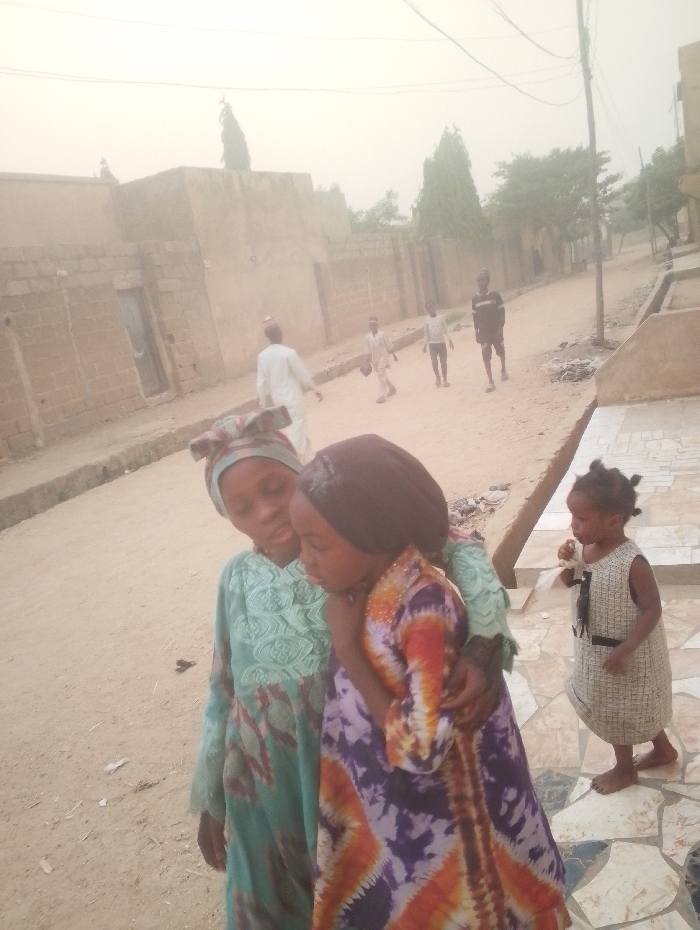 Two young girls in colorful dresses embrace on a dusty street. One girl wears a turquoise dress and head wrap, the other a vibrant tie-dye pattern. A small child in a simple dress stands to the right, eating something. In the background, several people walk down the street lined with mud-brick buildings under a hazy sky.