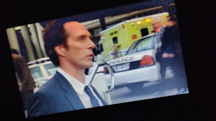 The image displays a still frame, captured at an oblique angle from a screen, depicting an urban scene in what is specified as Schiltigheim, France, with emergency services present. In the foreground, a light-skinned male individual is depicted in profile, facing right. He has a receding hairline with short, dark, textured hair, prominent cheekbones, and a slightly open mouth. He wears a white collared shirt, a blue and white striped tie, and a dark blue suit jacket. A silver-colored, curved metallic handrail or barrier is partially visible in front of his lower torso. In the midground, behind the main subject, a white police car is visible from the rear, featuring the word "POLICE" in dark letters across its trunk lid. Red taillights are visible. Further in the background, a bright yellow/lime green ambulance with illuminated emergency lights is partially visible behind the police car, suggesting an active scene. Blurred figures, including one appearing to wear light-colored attire near the ambulance and another in dark clothing to the right of the police car, are present. Another vehicle, possibly a police car, is partially visible in the far left background. The background consists of indistinct, dark building facades, indicative of a city environment. The overall lighting suggests daylight.