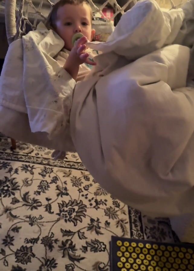 A baby lies wrapped in a white blanket in a macrame hammock chair inside a house, sucking on a pacifier and raising one hand