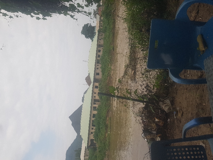 The image depicts an outdoor riparian scene under an overcast sky. In the foreground, two dark-colored plastic chairs are partially visible, positioned on dirt ground. The chair on the right has a yellowish-green object, possibly a piece of fruit or refuse, resting on its seat. A muddy, brown river or large stream occupies the midground, its surface showing slight ripples. The riverbanks are characterized by sparse, unkempt green vegetation and scattered debris, including plastic bags. A slender, dark-colored vertical post or stake is visible near the water's edge on the left. On the far bank of the river, a row of approximately five single-story buildings is visible. These structures feature light-colored, possibly unpainted masonry walls and light green corrugated metal roofs. They appear uniform in design and are partially obscured by surrounding vegetation. In the background, several large hills or mountains rise under the grey sky, with one distinct peak visible towards the left. Dark green foliage hangs into the frame from the upper right corner. No people are visible. The specific location within the city of Atlanta, United States, cannot be determined from the visual information provided.