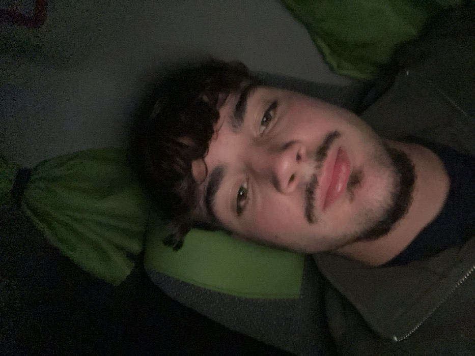 A young man with curly dark hair and a dark mustache lies on a green pillow in what appears to be a tent