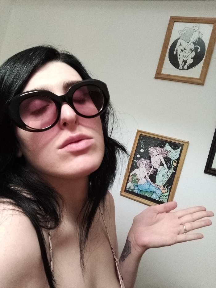 A woman with dark hair and large, round, pink-tinted sunglasses poses against a white wall adorned with three framed pictures. She wears a spaghetti-strap top. Her lips are slightly pursed, and she extends her hand toward the viewer. A small tattoo is visible on her left forearm, and a ring is on her finger. The artwork depicts mermaids and fantasy creatures.