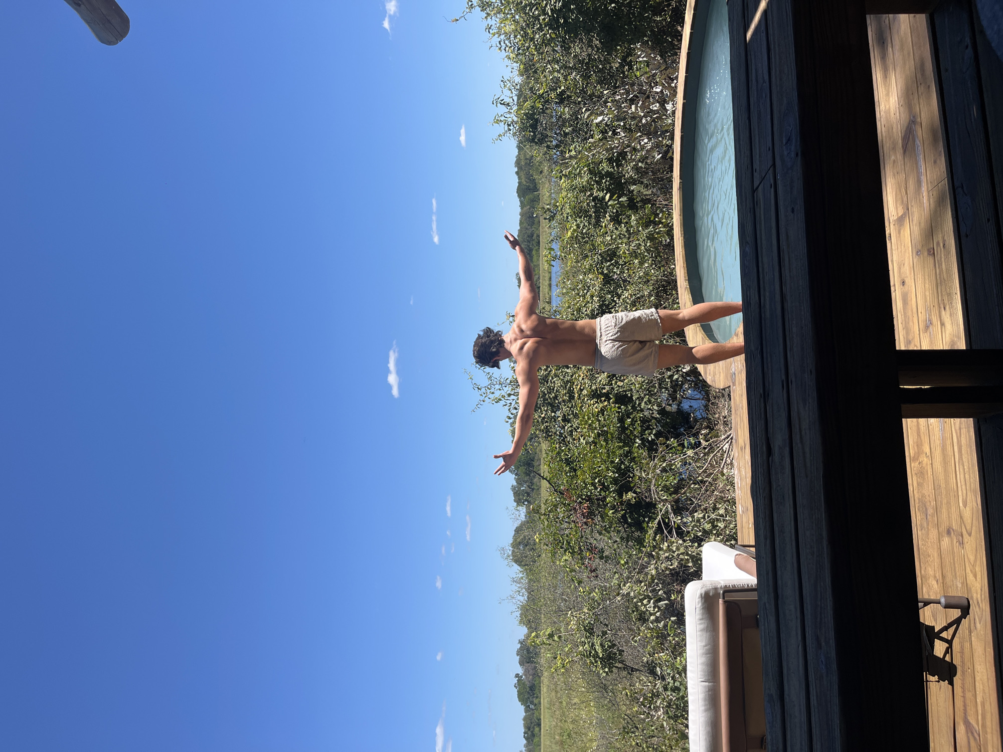 A shirtless man in light-colored shorts stands on a wooden deck with arms outstretched, appearing to look out over a marshy landscape in what is likely the Khwai region of Botswana, as the foliage suggests a wetland ecosystem. A circular wooden pool is located to the right of the man on the deck. A wooden structure frames the right side of the image, partially obscuring a glimpse of a light-colored couch. The sky is clear blue with a few scattered clouds. The scene is brightly lit, suggesting a sunny day.