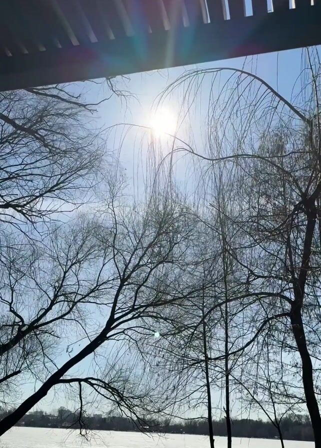 winter scene with a frozen lake under a bright sun. Bare trees frame the view of the lake, and the sun shines brightly through the branches. The view is partially obstructed by a wooden pergola or structure above. The overall impression is a cold, sunny winter day.