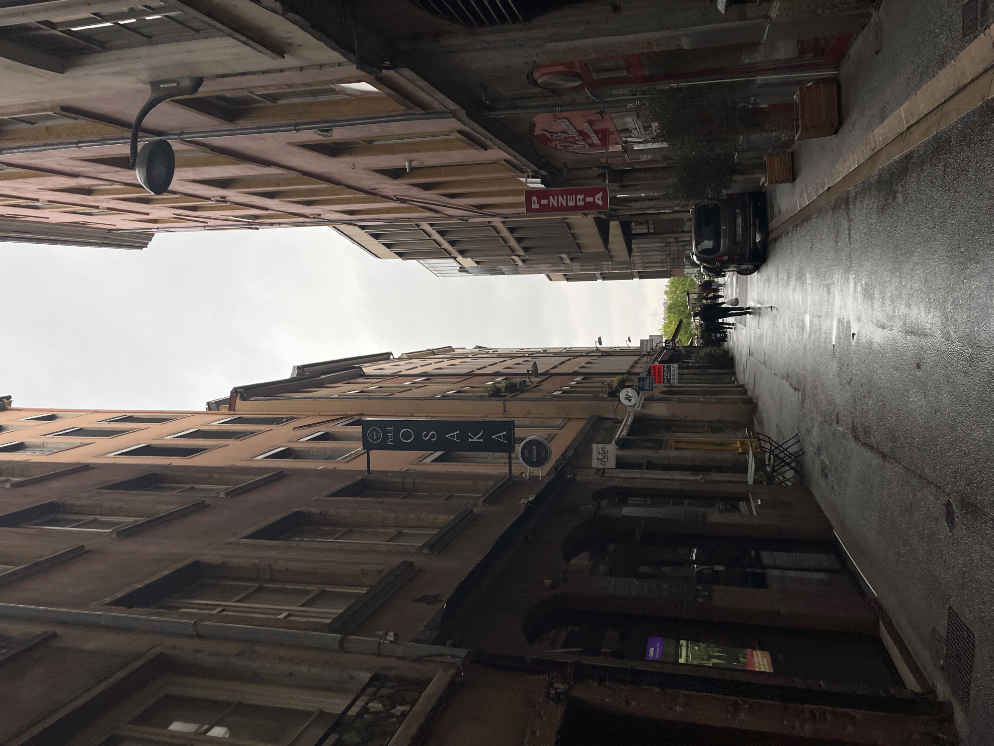 This is an exterior shot of a narrow street in Lyon, France, viewed from a low angle, looking upwards towards the sky. The street is lined with tall buildings on both sides, their facades showing a mix of architectural styles and varying shades of tan and brown. Many windows punctuate the buildings. The street is wet, reflecting the overcast sky and creating a glossy surface. Various signs are visible on the buildings, including one that reads "PIZZERIA" in reverse, "petit OSAKA", "OSAKA", and "chan". A streetlamp is attached to one of the buildings. Several people are walking along the street in the distance, near a parked dark-colored van. There are also a few potted plants along the edge of the street, and tables and chairs are outside one of the establishments.