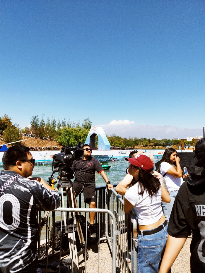 At a waterside event, a cameraman operates a professional camera on a tripod, facing the water where kayakers compete. A crowd gathers behind a barrier to watch the competition. In the background, there's an archway branded with "Red Bull," likely the finish line. Other trees and mountains are visible in the far distance under a clear blue sky. Various spectators stand near the barrier, observing the event, while someone on the left is wearing a jersey.