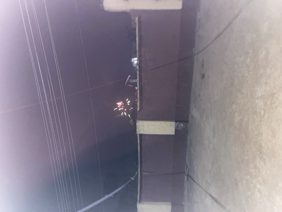 A nighttime image captures fireworks exploding in the sky. Power lines crisscross the left side of the frame, while a building's exterior wall dominates the right. The wall is painted light beige with a brown column and white square protruding from it. At the center, people stand on a rooftop overlooking the fireworks display. The overall scene is a blend of urban infrastructure and festive celebration.