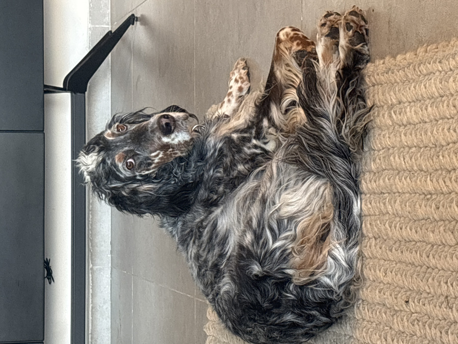 - "An English Setter, exhibiting a blue belton coat with black, white, and tan markings, lies curled on a light-brown woven rug" by FM-flFwG2, licensed under CC BY 4.0