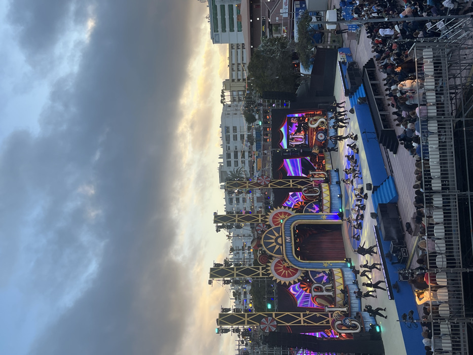 The image displays an outdoor performance venue in Playa Del Inglés, Spain, captured from an elevated perspective. A large, multi-level stage occupies the midground, featuring a vibrant, circus-themed backdrop with the word "CIRCUS" prominently displayed and a central arched entryway. The stage incorporates multiple LED screens exhibiting colorful, abstract patterns. Approximately 30 to 40 individuals, dressed in dark clothing, are engaged in a synchronized performance routine across various platforms and steps of the stage. Below and to the right, a seated audience occupies rows of white temporary chairs, observing the ongoing performance. The background reveals several multi-story white buildings and palm trees beneath a partially cloudy sky, characterized by shades of grey, blue, and hints of yellow-orange, consistent with dusk. Various event-related structures, including lighting rigs and equipment, are visible around the stage perimeter.