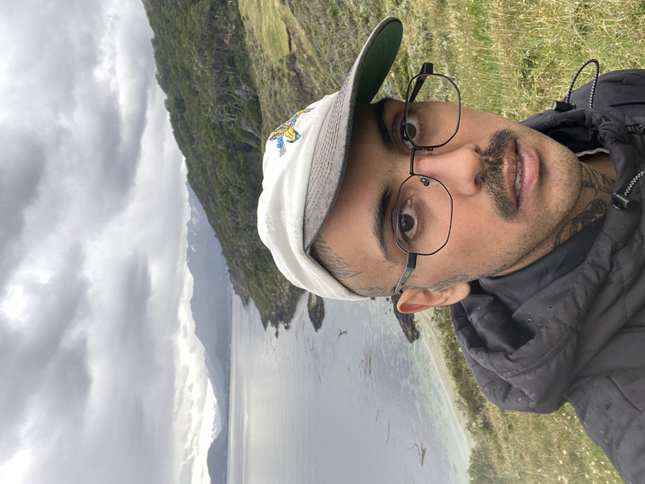 A man with a mustache and tattoos, wearing glasses and a cap, poses for a selfie outdoors. A mountain with lush green vegetation stands in the background. In the distance, a body of water is partially obscured by low-hanging clouds. The man is wearing a dark-colored jacket, and the overall scene suggests a cool or overcast day.