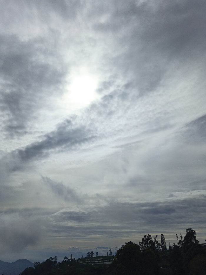 Overcast sky dominates the view, with the sun barely visible through a thick layer of clouds. The lower portion of the image reveals a landscape of hills covered in lush, dark green trees. Terraced fields can be spotted among the trees, suggesting agricultural activity. In the distance, mountains emerge faintly, shrouded in haze. The overall tone is subdued, creating a sense of tranquility.