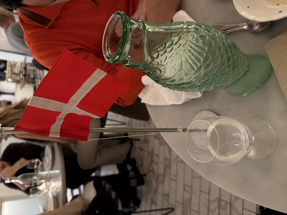 The image depicts a dining table within a restaurant or cafe in Copenhagen, Denmark