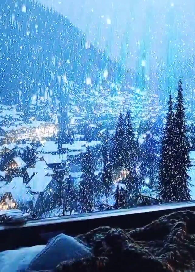 view from inside a room, looking out through a large window. Outside the window, there is a snowy landscape with a village nestled in the valley. The rooftops of the houses are covered in snow, and the lights from within them cast a warm glow. Tall pine trees, heavily laden with snow, dot the landscape. Snow is falling steadily. Inside the room, there is a bed covered with a textured blanket and a pillow. To the side, a fireplace crackles with burning wood. The overall scene creates a cozy and peaceful atmosphere.
