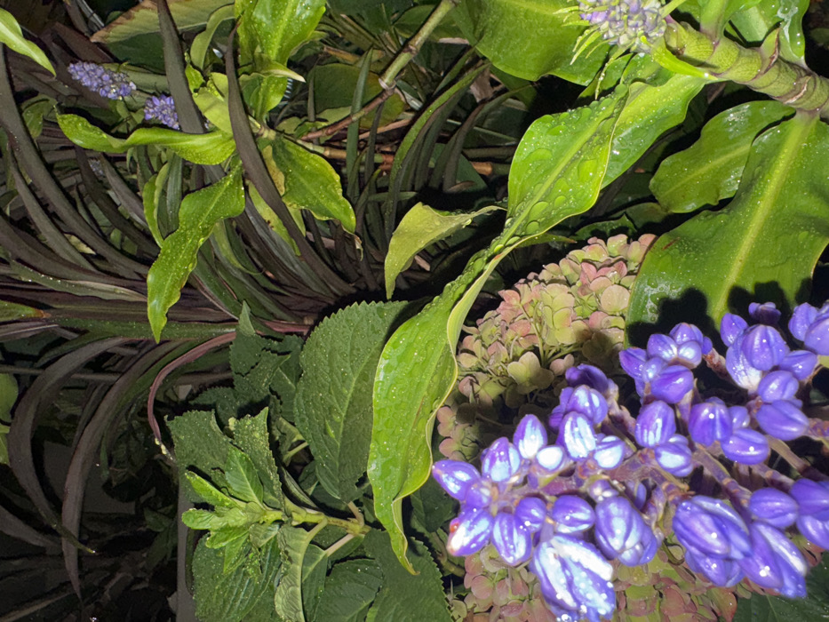 The image displays a detailed close-up of a dense botanical arrangement, illuminated under low-light conditions, indicative of nighttime, in Durban, South Africa. The foreground features a prominent cluster of vibrant purple, elongated flower buds, possibly *Dichorisandra thyrsiflora*, on the lower left, completely covered in minute water droplets. To the right and slightly behind this cluster, a large, textured inflorescence with muted green and reddish-pink tones, resembling a Hydrangea bloom in a state of development or decline, is also visible, similarly adorned with water droplets. Various green leaves, some broad and smooth, others with serrated margins, intermingle with darker, purplish-brown foliage and stems in the background, all surfaces uniformly glistening with water droplets. No human subjects or actions are depicted.