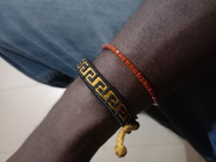 The image presents a close-up view of a dark-skinned forearm and wrist, oriented from a slightly elevated perspective. Two distinct bracelets adorn the wrist. The lower bracelet is a black fabric band featuring a continuous yellow Greek key (meander) pattern, with a visible yellow knotted cord end. The upper bracelet consists of a single strand of small, reddish-orange, cylindrical beads. Partially visible in the upper left quadrant is a textured blue fabric, consistent with denim clothing. The background is an undifferentiated, light-toned surface. No specific environmental features or identifying markers are present to determine a precise location within Kuje, Nigeria. The scene depicts a static display of the arm and its accessories.