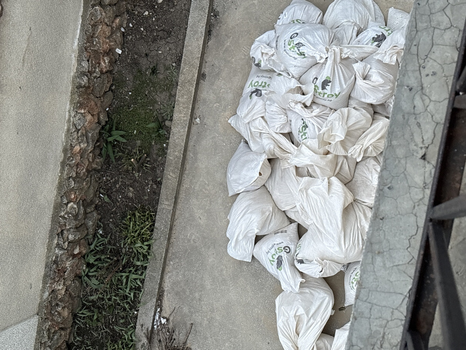 The scene depicts an outdoor area in Stefan Karadja, Bulgaria, captured from an elevated perspective looking down. Approximately two dozen white woven polypropylene sacks, appearing full and tied, are piled on a grey concrete surface. Many of the sacks are marked with a green logo featuring text that includes "GStroy" and "www.gstroy.bg," along with a stylized graphic resembling an animal. The concrete surface exhibits minor cracks. Adjacent to and above the concrete where the sacks are located, there is a narrow strip of disturbed soil with sparse green vegetation, including grass and weeds. This strip is bordered by a dry-stacked stone wall or retaining wall, constructed from irregularly shaped stones. Above this stone wall, another grey concrete surface or wall is visible. In the immediate foreground, a dark, angled metal structure, likely part of a railing or balcony, is partially visible. No individuals are present in the image, and no specific actions or interactions are depicted.