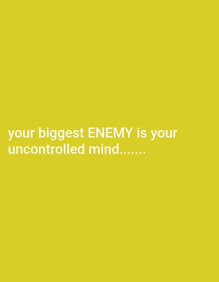 The image displays white text centered on a solid yellow background. The text reads: "your biggest ENEMY is your uncontrolled mind........". The word "ENEMY" is capitalized. The environment consists solely of this uniform yellow field, with no discernible physical features, objects, people, actions, or interactions. No specific location in the city of Unknown, Unknown, or any other city, is depicted or can be inferred from the content.