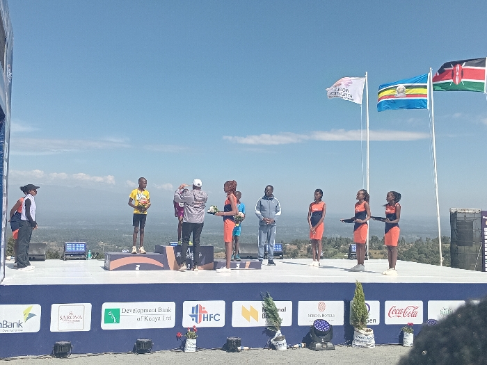 A podium features athletes receiving awards, presumably after a race. Three individuals, including one in a yellow shirt, stand on the numbered platforms. An adult in a gray jacket seems to be presenting the awards. Three women in orange and black dresses hold trays. The flags of Kenya and Tanzania, along with another white flag, are displayed in the background. The backdrop reveals a scenic landscape under a blue sky. Sponsorship logos are visible on the platform's front, including Coca-Cola, HFC, and Sarova Hotels.