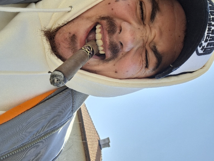 The image captures a close-up, upward-angled view of an adult male in an outdoor setting in Rakitovo, Bulgaria. The subject, visible from the mid-chest, is wearing a black and white baseball cap, a cream-colored hooded sweatshirt, and a grey jacket with an orange interior lining visible on the right side. He possesses facial hair, including a goatee, and multiple visible moles on his face. His eyes are squinted shut, and his mouth is open wide, revealing his upper teeth and tongue. A lit cigar, featuring a dark band with partially visible gold text "PORUM" and "HAVANA," is held in his mouth, displaying a prominent ash and a glowing ember at its tip. The background consists of a clear, bright blue sky, with a light-colored building featuring an orange-tiled roof and a chimney visible in the lower right quadrant.