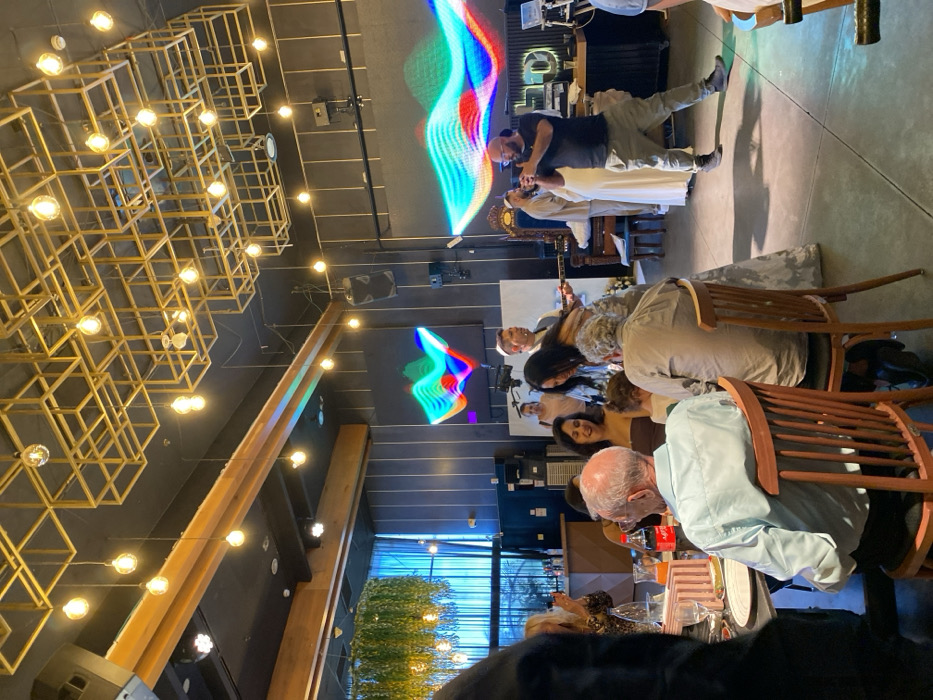 The image depicts an indoor event taking place in a modern venue in Holon, Israel. The scene features a gathering of approximately a dozen individuals, some seated at dining tables and others standing, engaging in a celebration or ceremony. The environment is characterized by a dark ceiling with exposed golden, geometric lattice lighting fixtures, from which multiple Edison-style bulbs are suspended. A wooden beam spans the upper left portion of the frame. Dark, vertically paneled walls frame the background, featuring two large digital displays exhibiting dynamic, colorful waveform patterns. A bar area with a large window and hanging green foliage is visible on the far left. The floor appears to be concrete or large tiles. In the foreground, an older man with glasses and a light blue shirt is seated at a table, facing away from the camera, with a Coca-Cola can and a glass of orange juice visible on the table. Adjacent to him, another individual with grey hair is also seated, facing away. To their left, a woman with dark hair in a strapless top smiles, with a small child partially visible beside her. In the mid-ground, a woman with long dark hair, wearing a patterned long dress, stands holding a stringed instrument resembling a bouzouki or oud. She is positioned near a man with a dark vest and yarmulke, who is playing a guitar. Further to the right, a man with a bald head and glasses, wearing a dark t-shirt and light pants, is actively photographing the scene with a professional camera. Behind him, another man wearing a white robe (Kittel) and a yarmulke stands next to an ornate, dark wooden chair, possibly an Elijah's chair. Additional indistinct figures are present in the background. The event appears to involve live music and photography, suggesting a festive and possibly ceremonial occasion.