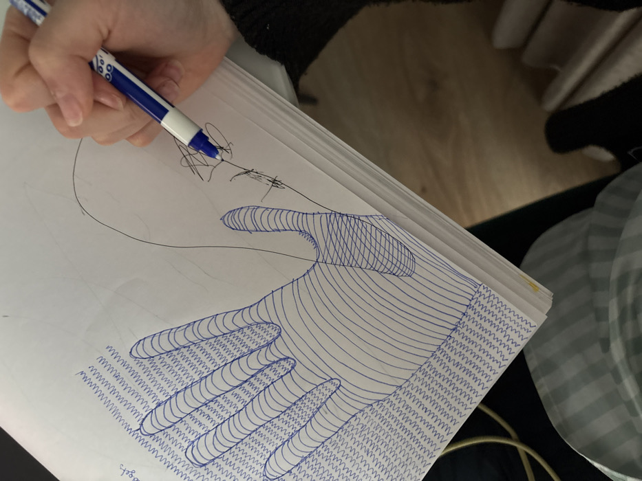 This image depicts a drawing scene in Crevedia, Romania, captured from an overhead, slightly angled perspective. A person's right hand, characterized by fair skin and visible fingernails, is positioned in the upper right section, actively holding a blue and white marker pen. The pen's blue tip is in contact with a white sheet of paper, making blue marks. The paper displays a prominent drawing of a left hand, rendered in blue ink using a series of parallel curved lines to create a three-dimensional effect. The area to the left and partially above the drawn hand is filled with repetitive small, wavy blue lines. Faint blue handwritten text, possibly "rogs," is visible in the upper left corner of the paper. To the right of the drawn hand, black outline work and blue scribbles indicate additional or unfinished drawing activity. The white drawing sheet is part of a stack of identical sheets, suggesting a notebook or sketchpad. A coiled yellow cable is visible on the far left edge of the frame. Below the paper and the cable, a light blue and white striped fabric, likely part of clothing, is partially visible. A dark-colored fabric, possibly a sleeve, is visible on the right arm of the person. The visible background surfaces include light-colored wooden flooring.