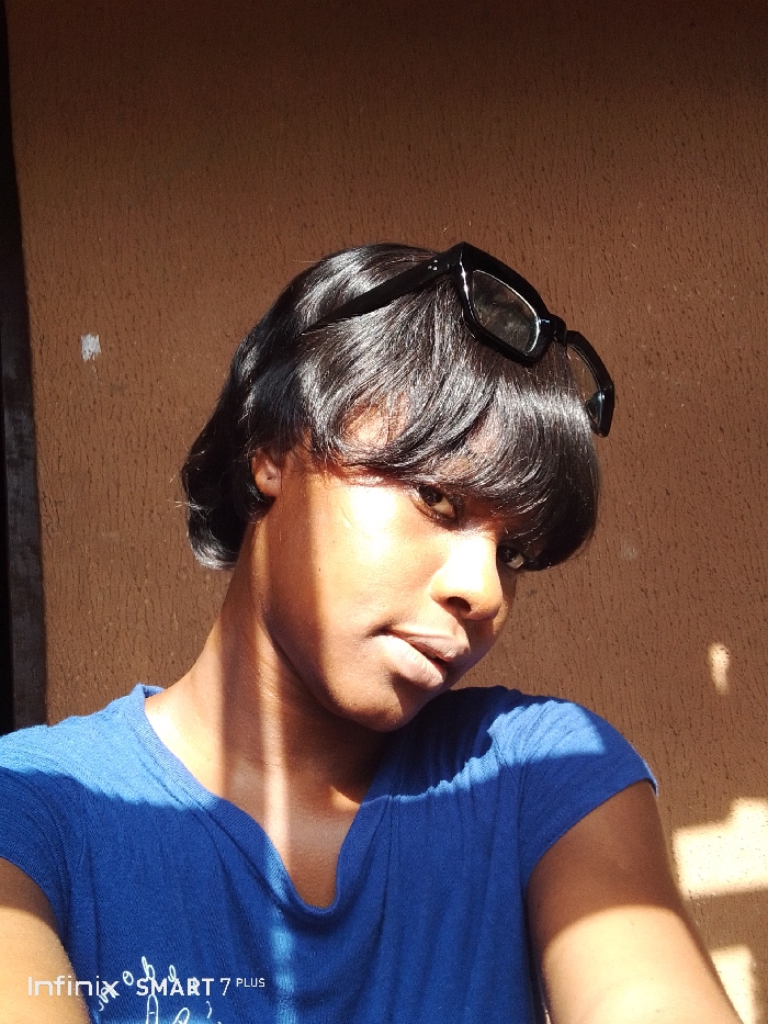 A close-up portrait shows an adult female facing slightly right, with her head tilted, against a textured light brown wall, in the city of Unknown, Unknown. She has dark skin, dark short hair with bangs, and black-framed glasses resting on top of her head. She wears a blue ribbed v-neck t-shirt. Direct sunlight illuminates her left side, casting shadows across her right side and neck. A dark vertical element is partially visible on the far left of the frame. The bottom left corner of the image displays a "Infinix SMART 7 PLUS" watermark.