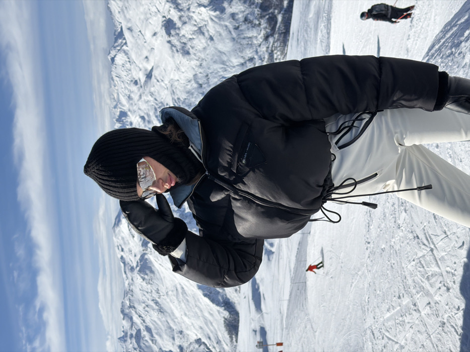 An outdoor scene in Saint-Martin-de-Belleville, France, depicts a snowy mountain ski environment under a clear blue sky with minimal cloud cover. The primary subject, a female individual, is captured in a three-quarter pose, standing on a snow-covered slope. She is wearing a black ribbed balaclava, silver reflective ski goggles, a black cropped puffer jacket with a "PRADA MILANO" emblem on the left chest, and light-colored (off-white) ski pants with visible black zipper and drawstring details. Black leather gloves cover her hands; her right hand is raised to the side of her face, near her goggles. Her body is slightly angled to the left, with her head turned forward or slightly left. The background features expansive snow-covered mountain ranges. In the mid-ground to the left, a skier in a red jacket is actively descending a groomed slope. To the far right, another individual in dark winter attire, carrying a backpack and holding ski poles, is positioned further down the slope. Orange ski markers are visible along the left edge of the ski run. The snow surface shows visible ski tracks.