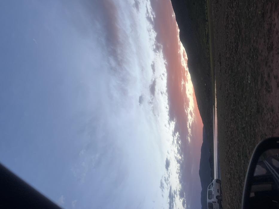 The image depicts a panoramic view of the Bin El Ouidane Dam reservoir in Bin El Ouidane, Morocco, at sunset. The scene is observed from inside a vehicle, with a portion of a side mirror visible in the lower-left corner and a dark frame encroaching from the upper-left. The sky dominates the upper portion, transitioning from deep blue at the top to a vibrant gradient of light blue, pink, orange, and red near the horizon, with scattered clouds reflecting these colors. A range of dark, undulating mountains or hills forms the distant horizon, silhouetted against the setting sun. Below the mountains, a calm body of water, the reservoir, stretches across the midground, reflecting the sky's colors. On the left side of the midground, two light-colored vans are parked on unpaved, uneven ground near the water's edge. The foreground consists of rough, dry earth with sparse, dark vegetation. No people, explicit actions, or direct interactions are visible.