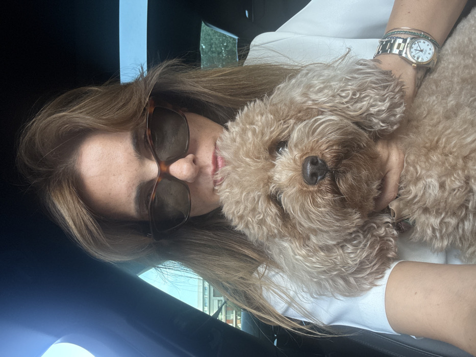 A female individual is depicted from the upper torso, seated within the dark interior of a vehicle, located in the city of Unknown, Unknown. She possesses light brown, shoulder-length hair and wears tortoise-shell sunglasses. Her visible lips exhibit a subtle red tint. She is dressed in a white top and her left wrist displays a two-tone (silver and gold) wristwatch with a white dial, along with two bracelets: one thin, gold-colored, and one composed of green and blue beads. She holds a small, light brown, curly-haired dog, resembling a Poodle, directly facing the camera. The dog has dark eyes and a dark nose. Through the vehicle's windows, a clear blue sky, distant light-colored multi-story buildings, and green foliage are visible, indicating an outdoor daytime environment. A sunroof is present in the vehicle's ceiling. The image is framed as a self-portrait.