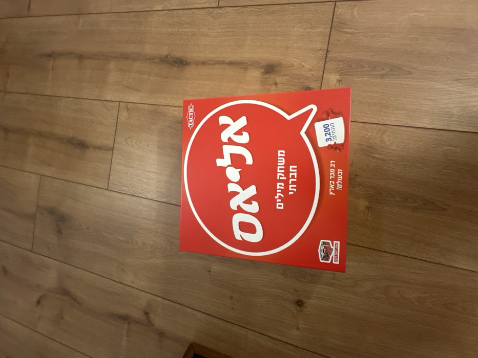 - "A red "Alias" board game box, featuring a white speech bubble graphic with the Hebrew word "אליאס" (Alias) and "משחק מילים חברתי" (Social word game), rests on a light brown wooden laminate floor" by FM-r6ou73, licensed under CC BY 4.0