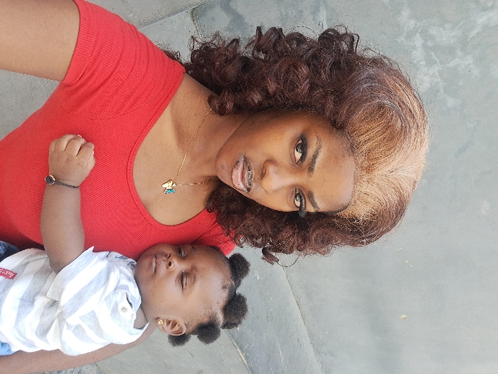 An image captured in the city of Ado, Nigeria, depicts an adult female holding an infant. The adult female, of dark complexion, wears a voluminous brown curly wig with a distinct light blonde frontal section. Her dark eyes are open, and she maintains a direct gaze towards the camera with a serious expression, her lips appearing glossy. She is dressed in a red short-sleeved, scoop-neck top. She wears a gold-toned necklace with a multi-colored butterfly pendant and a dark bracelet featuring a circular embellishment on her left wrist. The infant, also of dark complexion, has small afro puffs styled on its head and wears small gold-colored stud earrings. Dressed in a light-colored, possibly striped, short-sleeved t-shirt, the infant is held on the adult's left side, with its head resting on her shoulder and eyes closed, suggesting sleep or rest. The background consists of a plain, light grey, textured wall, with minimal discernible features. The scene is illuminated by bright, even lighting.